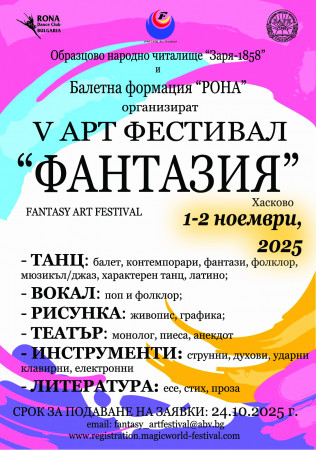 Арт фестивал "Фантазия" дава възможност на млади таланти да се изявят в различните видове изкуства - танц, вокал, музика, театър, изобразително изкуство и литература. Работим с авторитетно професионално жури, имаме богат награден фонд, най-добрите школи на нашите сцени, приятелска атмосфера, вълнение и усмивки, докато творим със своята фантазия!
